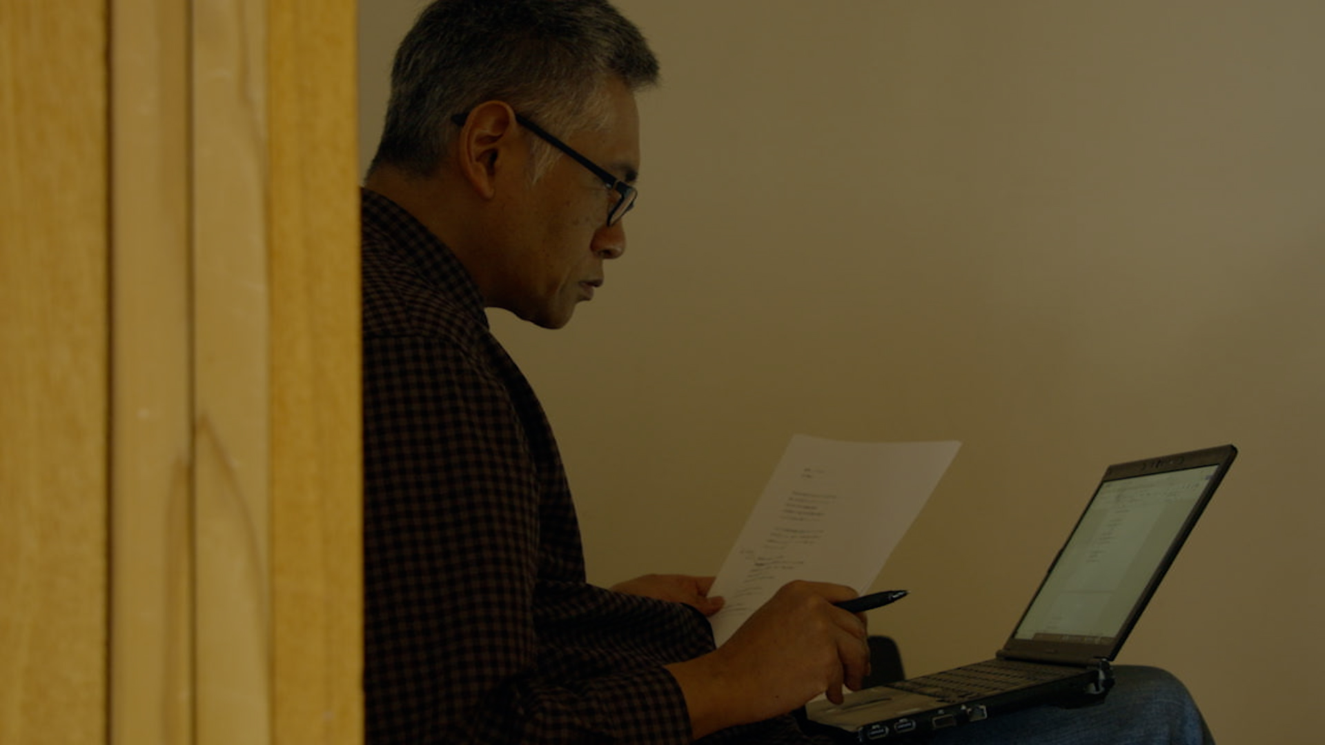パソコンとプリンターの前を、何度も行き来する。詩人が詩を生み出す瞬間というものは、非常に劇的なときのようにも思えるが、プリンターが詩を刷りだす音は、彼の日常の足音と重なるほど素朴に感じられた。